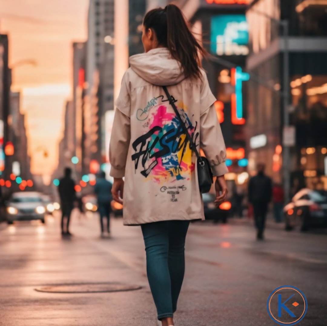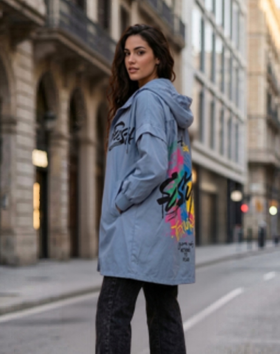 Chaqueta Larga de Mujer Urbana de Primavera con Capucha y Estampado
